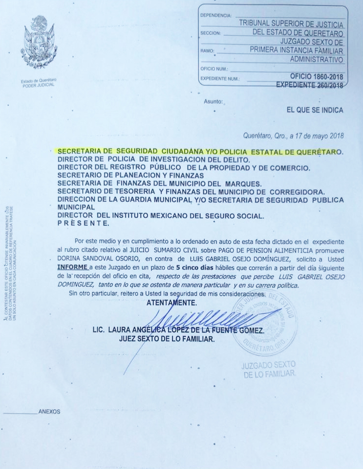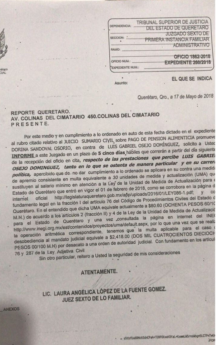En virtud de que no quisieron recibir por orden de los abogados, en la empresa Reporte Querétaro, propiedad del ahora candidato a la presidencia municipal de Querétaro, Luis Gabriel Osejo Domínguez, el oficio mediante el cual el Tribunal Superior de Justicia del Estado de Querétaro le solicita el informe de prestaciones percibidas por el mismo, el cuál fue ordenado en auto y que se giró además a muchas instancias, relativo al juicio Civil sovbre pago de pensión alimenticia promovida por una servidora Dorina Sandoval Osorio.